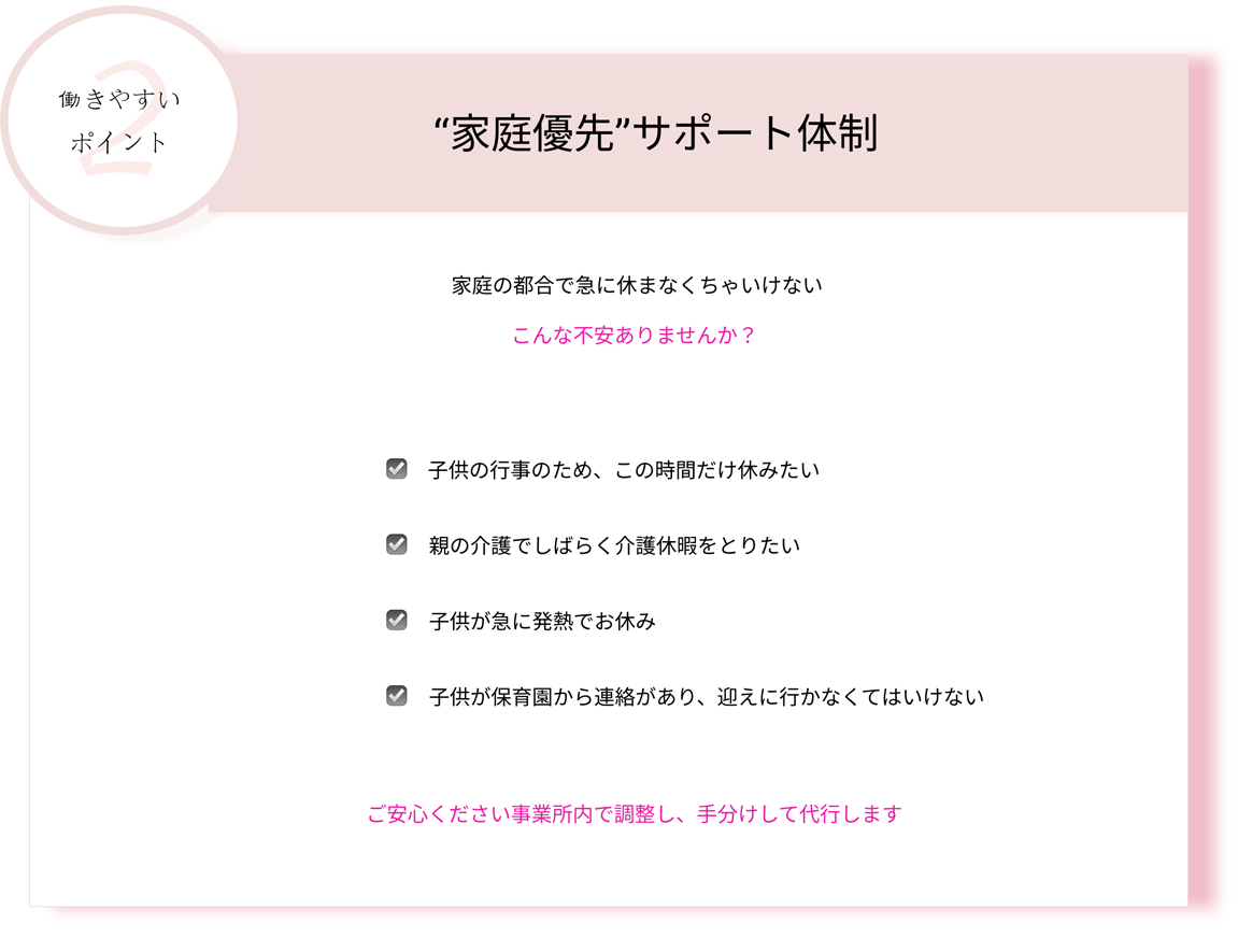 マイカー通勤可、制服貸与、子育て支援あり